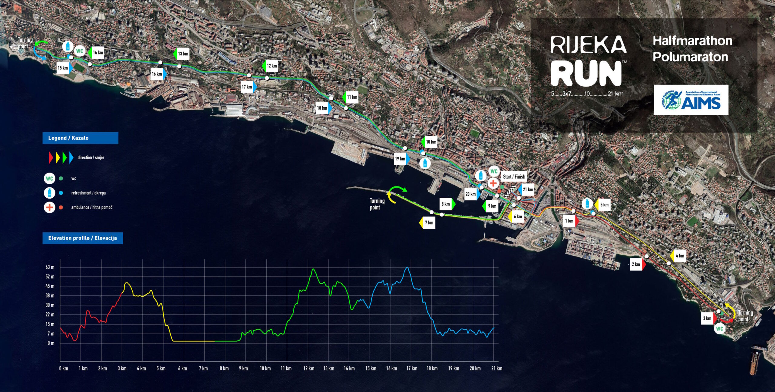 Sudionici 22. riječkog polumaratona trčat će rutom kroz središte grada, Pećine i zapadni dio Rijeke, preko Molo longa te do okretišta iznad Bazena Kantrida, nakon čega se vraćaju prema centru grada i cilju na Korzu.
